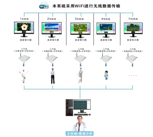 2.服務(wù)器通過無線路由器,可連接一臺(tái)或多臺(tái)治療儀主機(jī),服務(wù)器具有實(shí)時(shí)控制功能,可實(shí)時(shí)控制各治療主機(jī),亦具有用戶管理功能、播放模式選擇、訓(xùn)練方案編輯、療效報(bào)告功能、數(shù)據(jù)傳輸功能。
